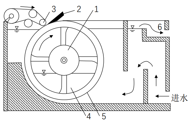 回转式机械格栅是一种常用的机械格栅,由机架、驱动、传动、滤网、清污及传送机构、电气控制等部分组成。筛网是由许多金属材质的小齿耙相互连接组成一个大的旋转面,在驱动和传动机构作用下,筛网可以由下向上回转,回转过程中将小齿耙截留的污物带出水面至格栅顶部,由顶部的橡胶刷清污机构反向运动清理干净,清理下来的污物落入下方传送带输送至污泥处理构筑物,被清理干净的筛网部分继续回转,循环往复。