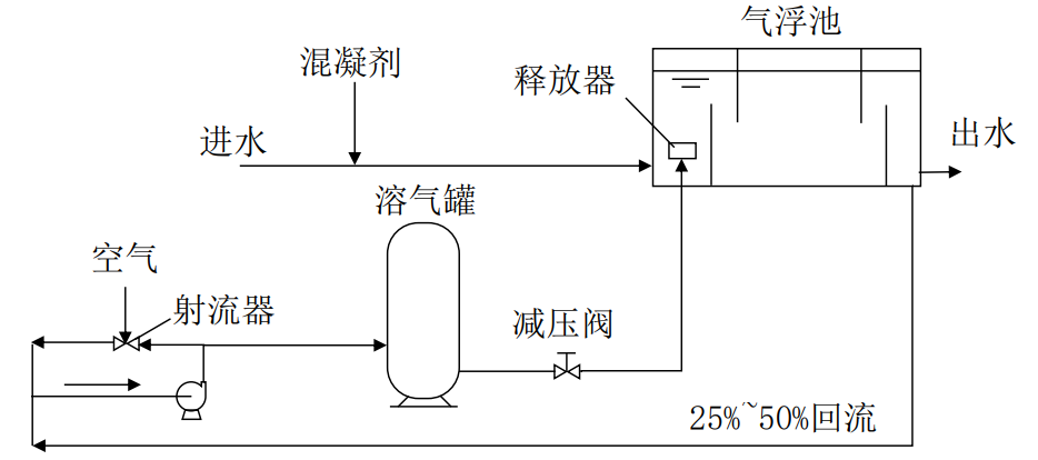部分回流溶气气浮是取一部分除油后出水回流进行加压和溶气,减压后进入气浮池,与进水混合、气浮的工艺。回流量一般为污水的25%~50%。