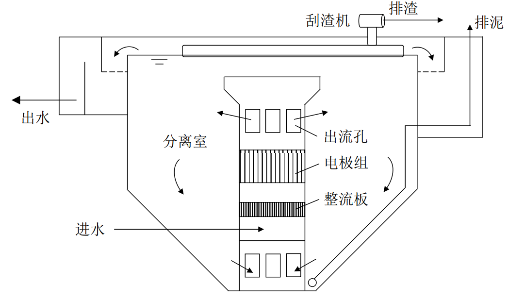 进水经过整流板平稳经过电极组发生电解,在阴极生成氢气泡,在阳极生成氢氧化物与污水中物质进行混凝,形成矾花。气水混合物从出流孔进入分离室内进行气浮,较重的矾花落入池底,由排泥管收集排出,气浮产生的浮渣上浮到表面被来回移动的刮渣机收集排渣,出水经溢流堰排出,净化完毕。