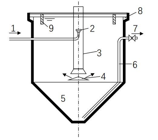 沉淀池运行时,废水经进水管进入沉淀池中心管,布水器出口向上使得污水能够以溢流方式进入,减少对中心管中污水的扰动。污水通过进水口下方出口进入截面积相对大的多的沉淀区,流速迅速降低,保持平稳、缓慢的流态进入,在反射板的阻挡下向四周分布,并沿沉降区断面缓慢上升。沉速大于水流上升速度的颗粒沉到污泥区,澄清水则由设置在周边的溢流堰溢流进入集水槽排出,表面的浮渣被挡板拦截、收集。池底椎体为泥斗,与水平倾角不小于45°,由于池深较大,一般采用静水排泥即可。