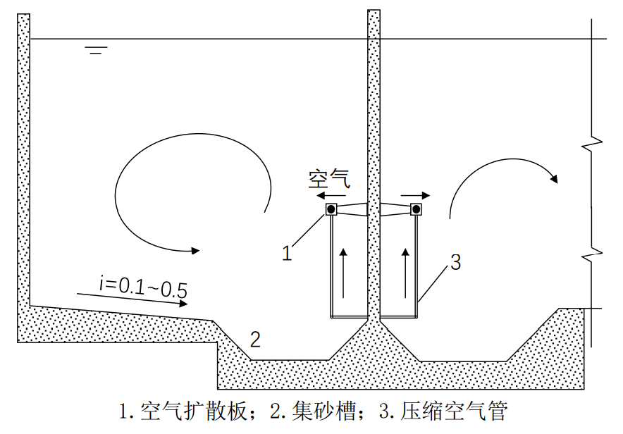 针对沉砂中有机杂质混杂,影响沉淀、造成沉砂腐败的问题,采用曝气沉砂池可以一定程度上解决此问题。曝气沉砂池是一长形渠道,沿池壁一侧的整个长度方向上安装曝气装置(距池底60~2250px高度上),下部设集砂斗,如图3-6。