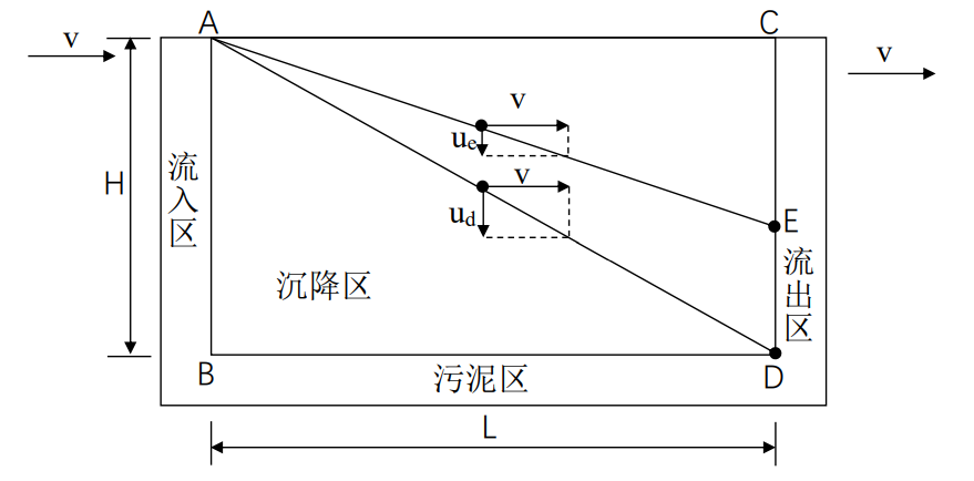 根据上述假设,悬浮颗粒在沉淀池内的运动轨迹是一系列倾斜的直线。其中以AD线为界,在AD以上的轨迹(如E颗粒的轨迹AE线)则表示该颗粒未能在固定的时间t内沉降至污泥区,随水流出未被分离。不难发现D颗粒正好在t时间内沉降,它的运动是在水平方向的水流推动(水平分速为水流流速v)和垂直方向力(重力与浮力的差值,垂直分速即沉降速度为ud)共同作用下完成的,因此把其沉降速度ud称为临界沉降速度,计为u0。