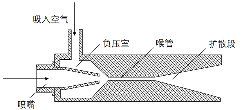 水流从管中经过喷嘴再到喉管,由于管径显著降低,水流的流速迅速增加,此时喷随出口除形成负压,不断的通过吸气管吸入空气,水流携带空气在喉管中进行剧烈的能量交换,空气被粉碎成微小气泡,然后进入扩散段,在扩散段由于管径逐渐增加,水流的动能降低而势能增加,在此情况下进一步压缩气泡,增加了空气在水中的溶解度,之后进入气浮池进行气浮。