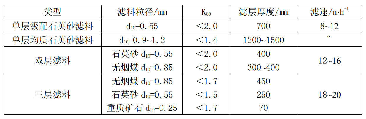 多层滤料目前常用的时双层或三层滤料,以双层滤料为例进行说明。双层滤料上层采用密度较小、粒径较大的轻质滤料(如无烟煤),下层采用密度较大、颗粒较小的重质滤料(如石英砂)。由于二者存在密度差,反冲洗后仍会保证上细下粗的滤层结构。实践证明,双层滤料的截污能力较同等深度单层滤料高1倍以上,同时可以增加滤速,处理能力得到提高,常用滤料规格及对应滤速范围见表3-1。