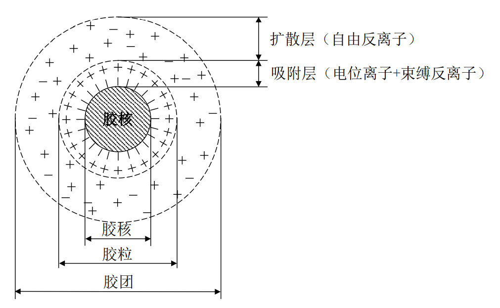 反离子中一部分被胶核牢固吸引并能够随胶核一起运动,称之为束缚反离子,束缚反离子和电位离子组成吸附层;另一部分距离胶核稍远,胶核对其吸引力较小,不随胶核一起运动,称之为自由反离子,自由反离子组成扩散层。最终胶粒和扩散层组合形成电中性的胶团。