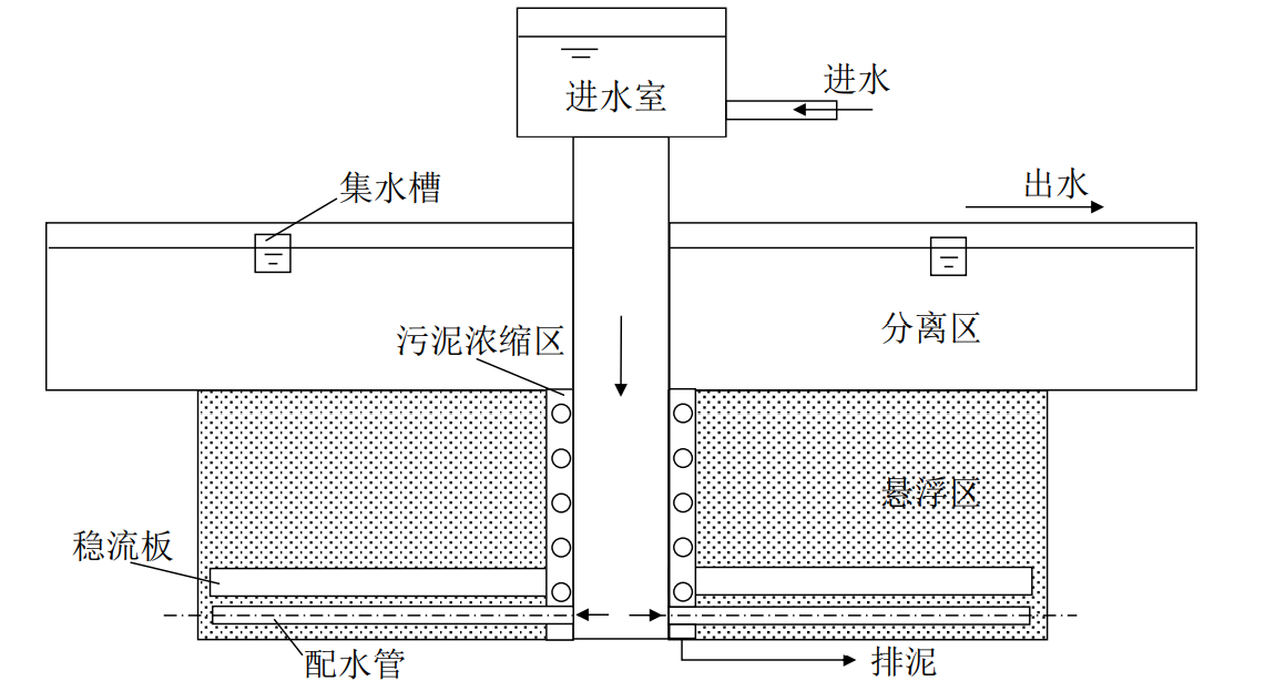 脉冲澄清池主要包括脉冲配水系统、布水和紊流板、悬浮区、泥渣浓缩区、分离区组成,如图3-29所示。