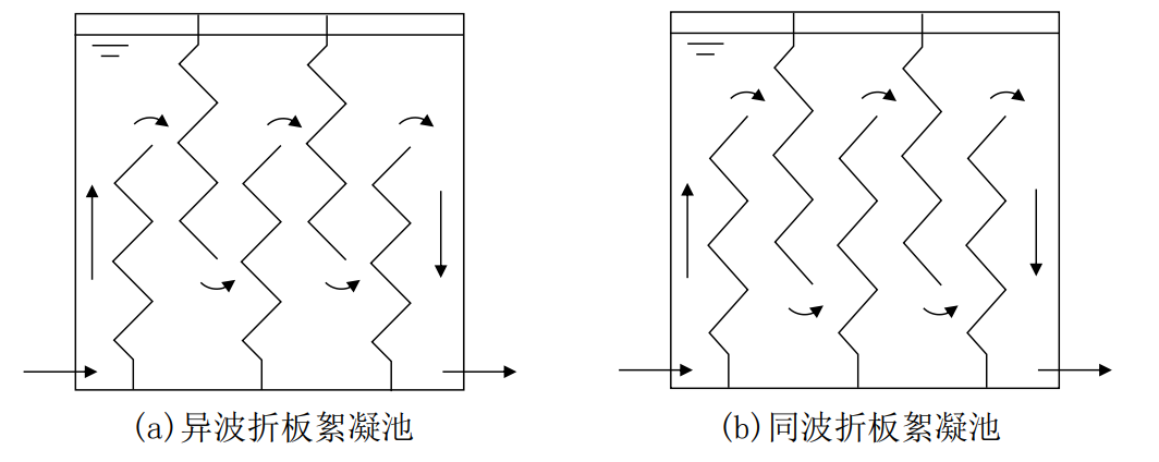 异波折板是将折板交错布置,使水流在通过收缩段时流速增加,通过扩张段时流速降低,从而产生絮凝反应所需要的湍动;同波折板絮凝池是将折板平行布置,水的流速不变,利用水通过转交处产生湍动产生絮凝所需要的水力条件。