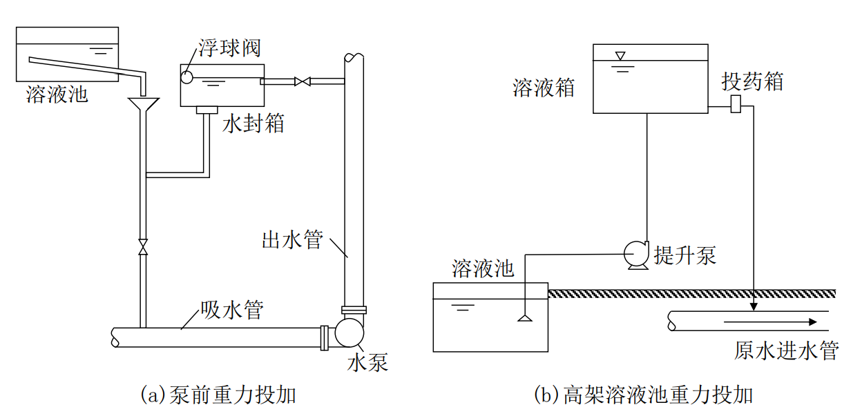 采用水泵进行混合时,药剂加在泵前吸水管或吸水井处,一般采用重力投加,即泵前重力投加,如图3-24(a)所示。当采用混合设备或管道混合时,在可以提高溶液池位置的前提下也可以使用重力投加,如图3-24(b)所示。