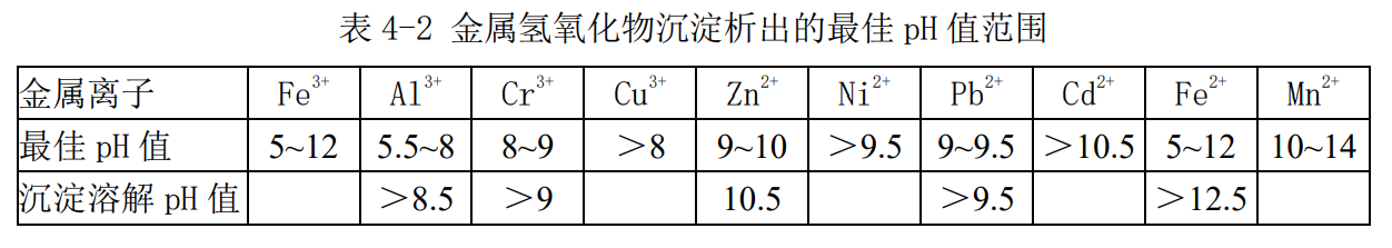 由于实际污水水质复杂,干扰因素很多,上述理论计算结果与实际由出入,因此实际操作时应通过对待处理污水进行试验来确定最适pH值范围。表4-2给出了一些金属氢氧化物沉淀析出的最佳pH值范围。