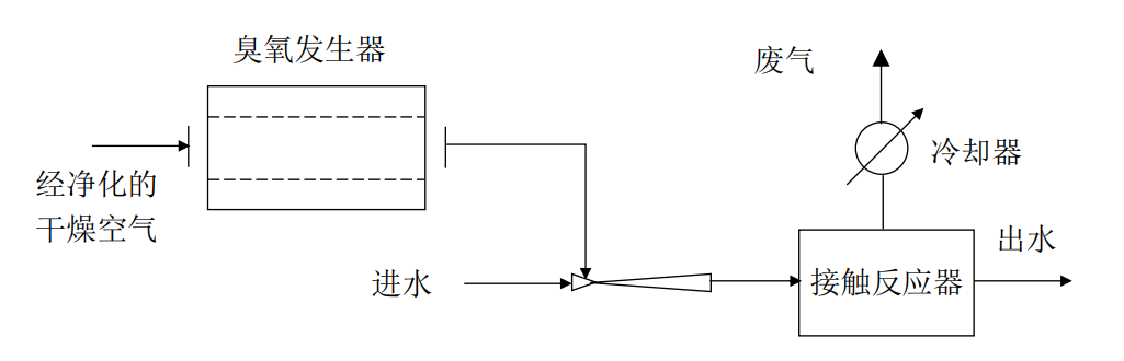 开路系统是以空气或富氧空气为载气,将臭氧混合其中,臭氧化的空气通过射流器与污水混合,之后送入接触反应器进行氧化反应,产生的废气经冷却后直接排放(开路),这种系统较为简单,如图6-2所示。