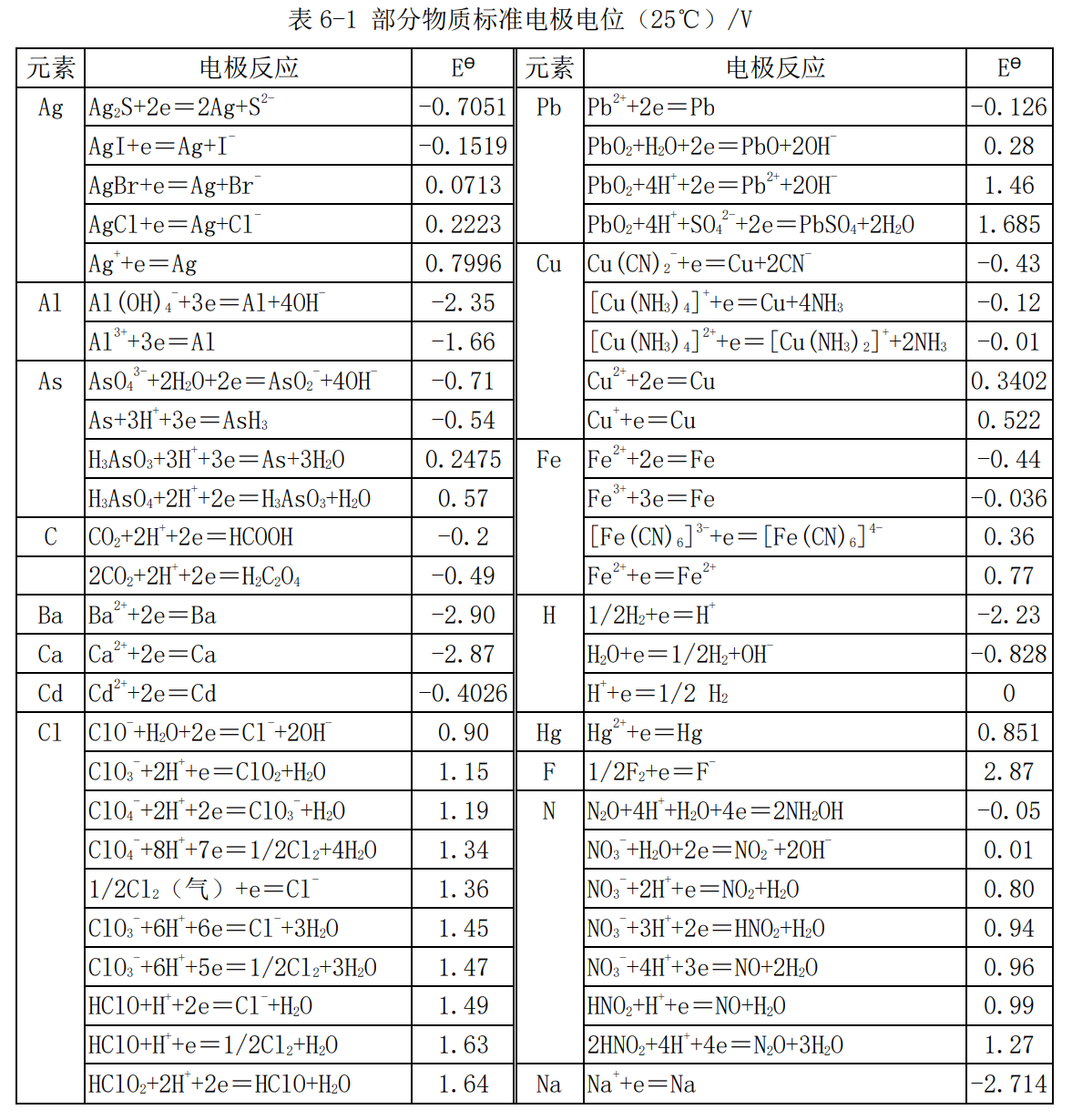 物质能否表现出氧化性和还原性,主要由反应双方的氧化还原能力的对比情况来决定。氧化还原能力就是指某种物质失去或取得电子的难易程度,可以用氧化还原电位(EƟ)作为指标,表6-1中列举了部分水处理中常见物质的标准氧化还原电位。