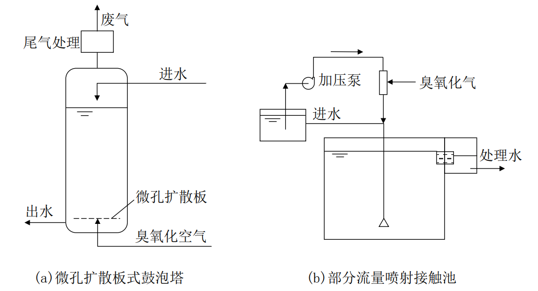 喷射器式接触反应器中部分污水被加压,通过射流器吸入臭氧化气,再和其他进水仪器进入接触池,设备特点式混合充分,但接触时间短,常用于处理含Fe2+、Mn2+、CN-、酚类、亲水性染料、细菌等污染物的污水。