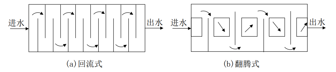 电解槽多采用矩形的形式,按水流方式可以分为回流式和翻腾式两种,如图6-4所示。