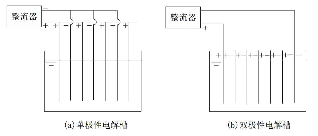 电解法采用直流电源,电源的整流设备应根据电解所需的总电流和总电压进行选择。目前国内使用的电解槽根据电路形式可以分为单极性电解槽和双极性电解槽两种,如图6-5所示。