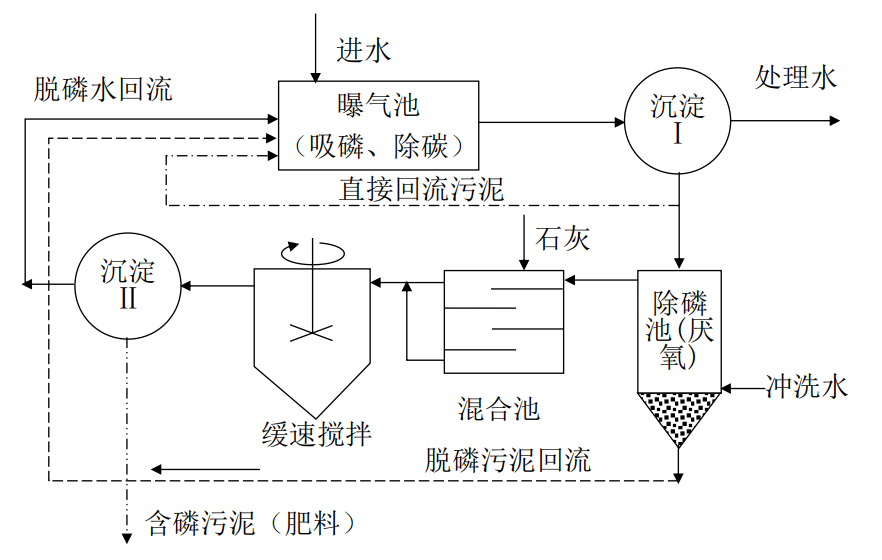(4)混合池中投加石灰,与污水中的磷生成难溶性磷酸钙沉淀。