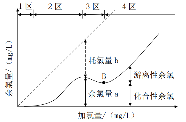 图中虚线斜率为1,即余氯量等于加氯量,表示在纯水中无杂质,没有消耗氯。同一加氯量条件下,虚线和实现之间的纵坐标差b即为耗氧量,而实线上每一点的纵坐标a即为余氯量。不同水质的加氯需氧量曲线是不同的,但是基本上呈现出图8-2中的趋势,通常根据曲线规律的不同可以把需氧量曲线分为4个区。