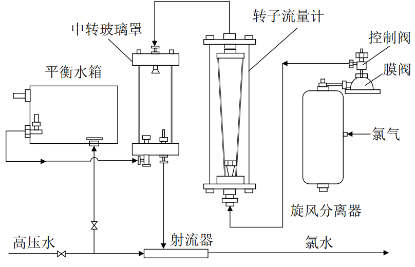 其工作过程为:来自氯瓶的氯气经过旋风分离器,将氯气中的悬浮杂质(如铁锈、油污等)分离出来,减压阀——弹簧膜阀保证瓶内安全压力大于0.1MPa,如氯瓶压力小于0.1MPa则该膜阀关闭,起到稳压的作用。纯净的氯气通过控制阀进入转子流量器,通过转子流量器和控制阀可以准确控制流量。中转玻璃罩用于观察加氯机的工作情况和稳定加氯量,防止压力水倒吸和当水源中断时破坏罩内真空的作用。平衡水箱可以补充和稳定中转玻璃罩内水量,当水流中断时自动暴露单向阀口,吸入空气,破坏罩内真空。射流器则利用负压从中转玻璃罩内抽吸所需的氯,并与水混合。