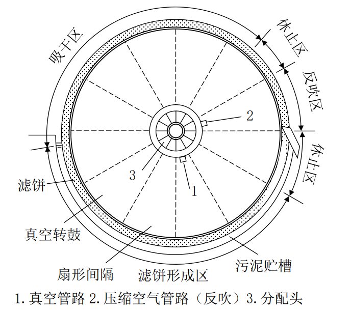 真空过滤是通过在滤下区保持负压而是污泥中的水分离的一种污泥脱水机械方法,常使用GP型转鼓式真空过滤机,其结构如图9-9所示。其主要部件是空心转鼓和污泥贮槽。转鼓每旋转一周依次经过滤饼形成区、吸干区、反吹区和休止区。