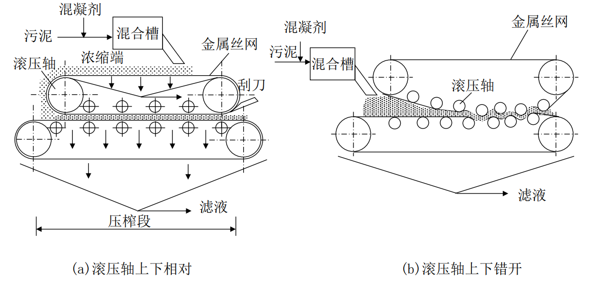 带式压滤机有两种形式:一种是滚压轴上下相对,压榨的时间几乎是瞬时,但压力大,见图9-11(a);另一种是滚压轴上下错开,依靠滤布的张力压榨污泥,因此压力较小,但压榨时间教唱歌,并且在经过滚压轴过程中,随着滚压轴的上下交错,泥饼的弯曲度交替改变(变形),对污泥的剪切作用使得泥饼进一步脱水。
