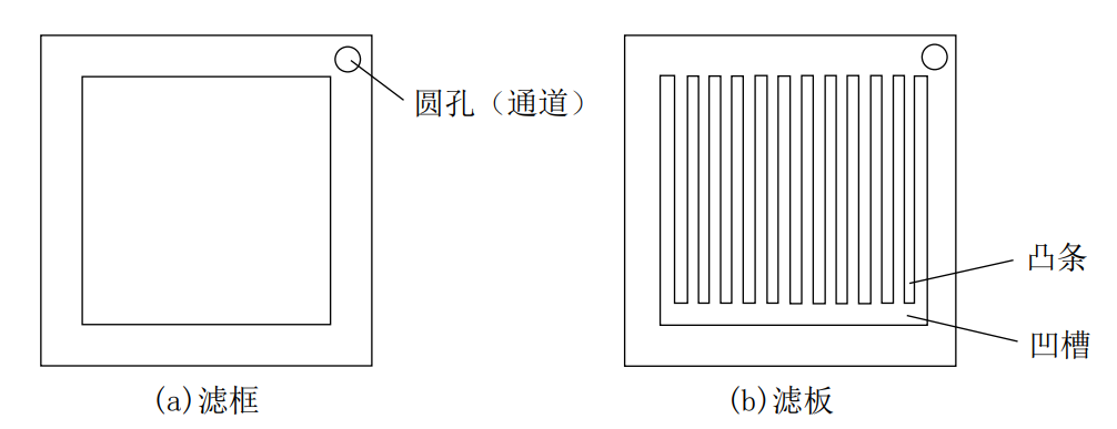 板框压滤机是一种典型的压力设备,即通过对污泥施加压力,使得污泥中的水透过过滤介质而分离。板框压滤机由滤板和滤框相间隔排列而成,在滤板的两面覆有滤布(多采用合成纤维织布),如图9-10所示。滤板的两侧面凸条与凹槽相间,凸条承托滤布,凹槽接纳滤液。凹槽与水平方向的底槽相连,把滤液引向出口。