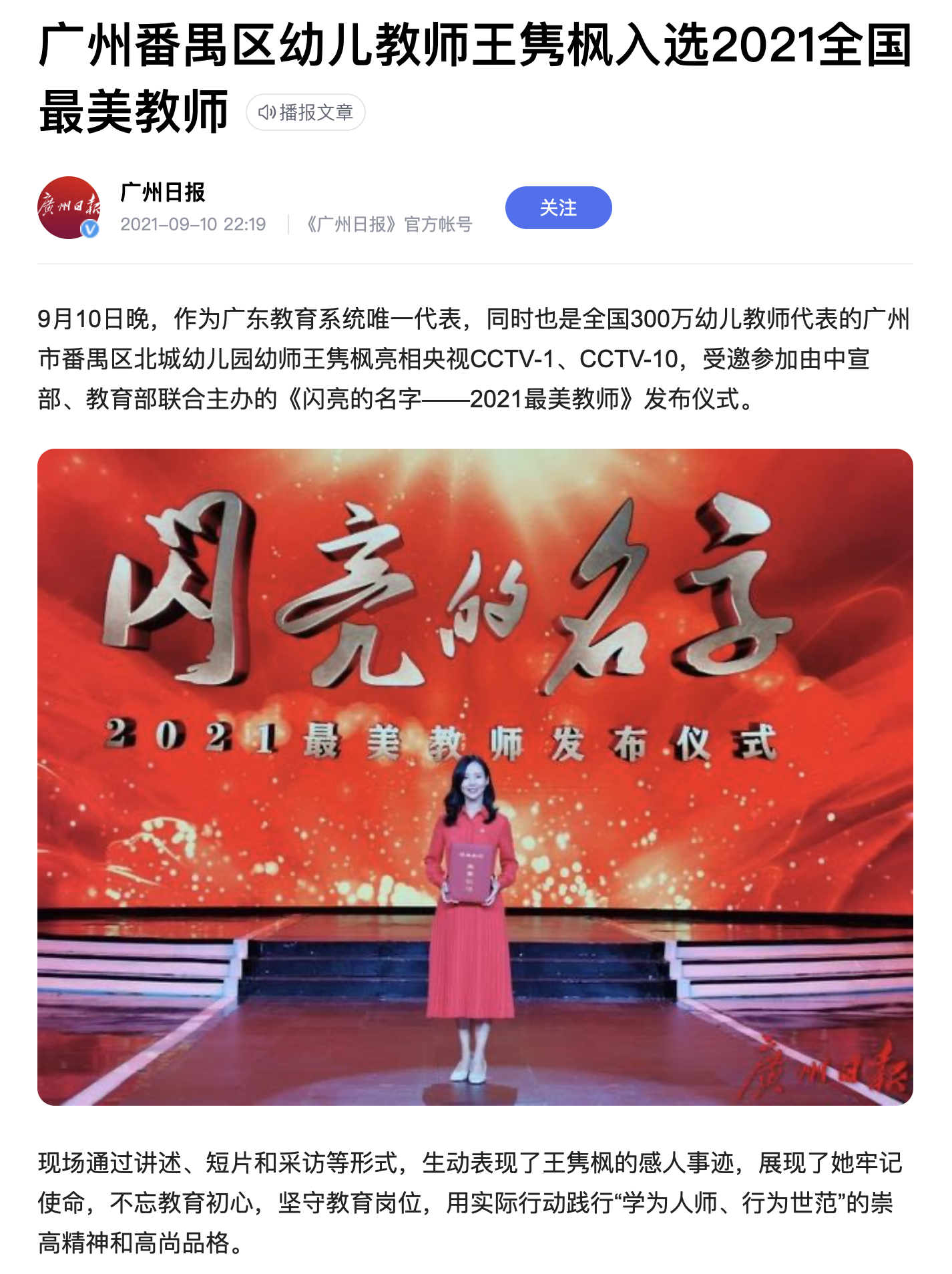 9月10日晚,作为广东教育系统唯一代表,同时也是全国520万幼儿教师代表的广州市番禺区北城幼儿园幼师王隽枫亮相央视CCTV-1、CCTV-10,受邀参加由中央宣传部、教育部联合主办的《闪亮的名字——2021最美教师》发布仪式。