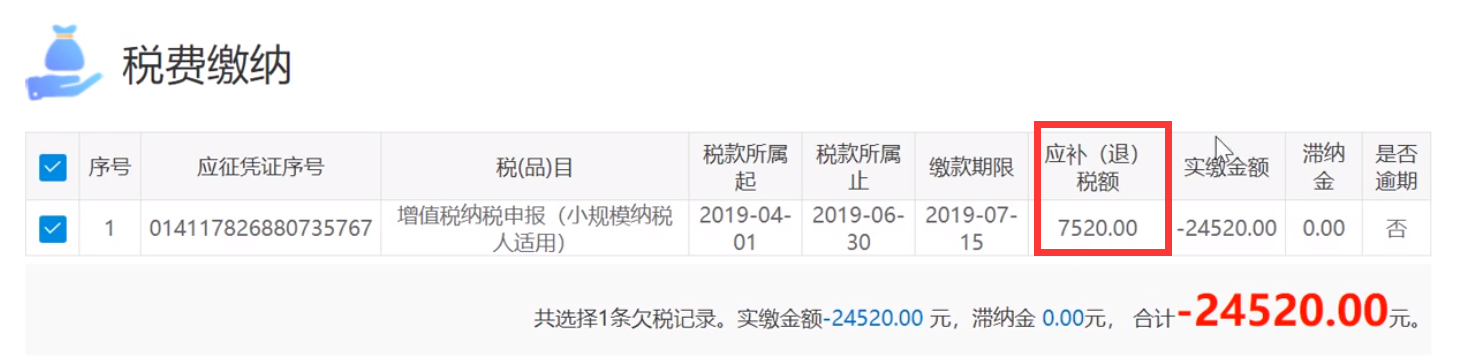 说明:视频中应补(退)税额为7520元,在缴费时出现-24520,大家不必混淆在意,做题操作以应补(退)税额为标准答案。