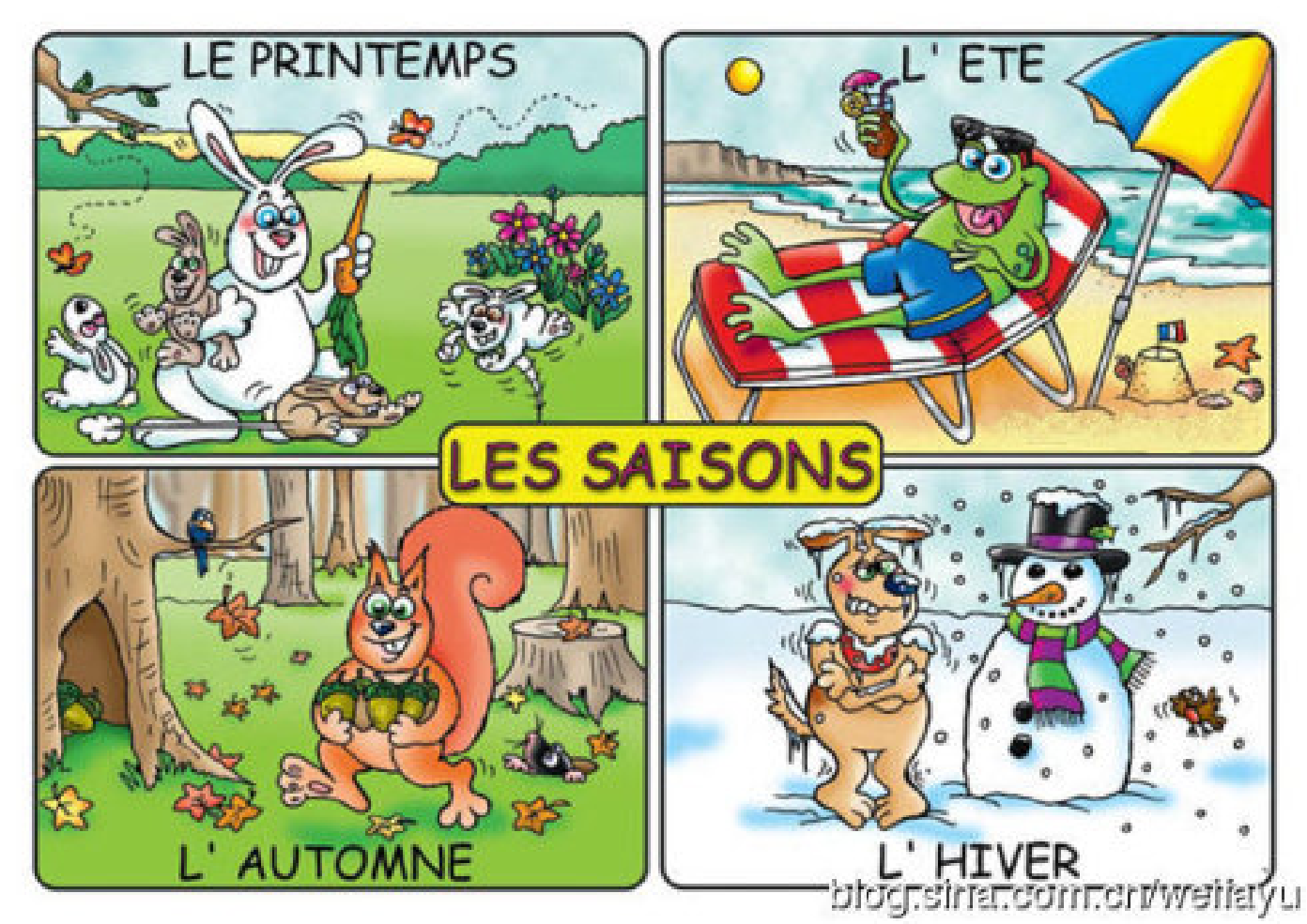 Au printemps②, le ciel est clair et bleu, le soleil brille, il fait beau③. Les arbres ont des feuilles vertes . Le printemps est la saison des fleurs. Les oiseaux chantent pour④ le printemps .