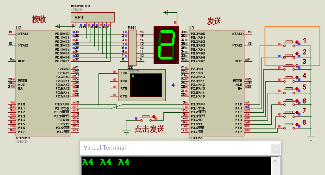 按下发送方某个按键:1-8,再点击发送按钮,接收方将收到的数据显示在共阳的数码管上。