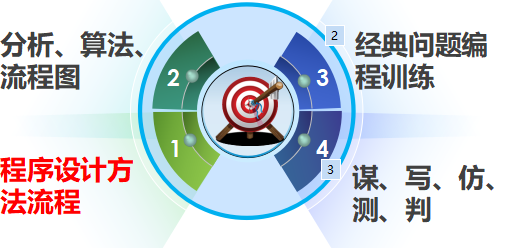 掌握几个经典问题的程序设计方案,如统计、推理、穷举、逻辑运算、排序等。学习基于工程教育理念的五步法程序设计流程:谋、写、仿、测、判。掌握算法设计的一般流程,即对实际问题的分析并抽象出必要的变量和常量等数据→确定数据类型→分析、推导出数据的变化规律及可能相互关系→重要的表达式。借助流程图规划、整理思路,应用计算机编程的手段训练逻辑思维习惯与能力,从而提升分析问题和解决问题的能力。从经典问题编程中体会运算、程序设计的乐趣和魅力。