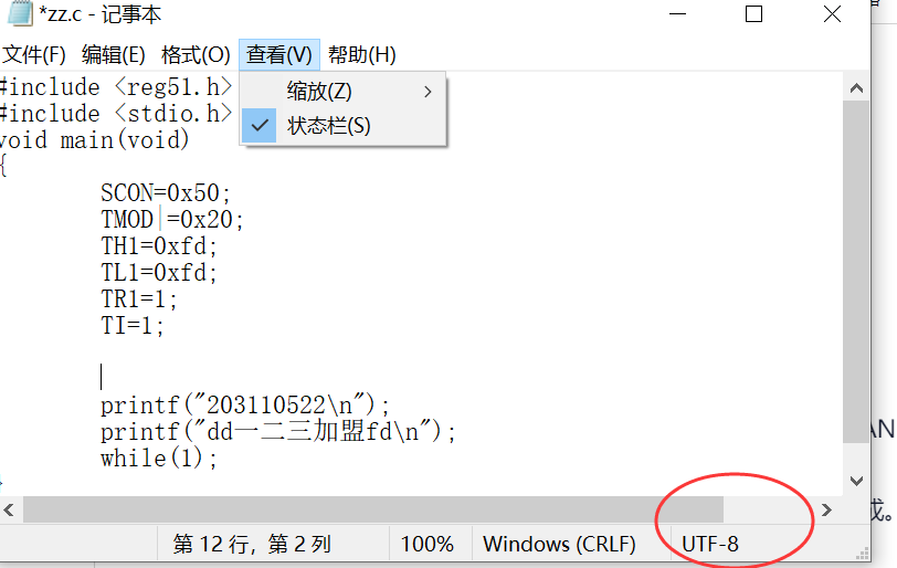 使用记事本打开源文件,在记事本右下角,可察看文件编码格式。