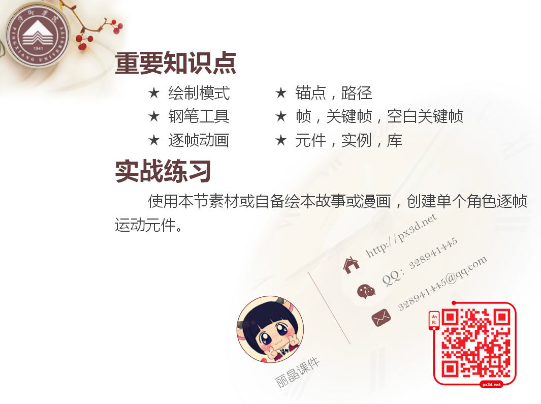 上一节课我们已经学会了用钢笔工具将弯弯乐园绘本课文中的图像描摹成矢量图,这一节我们要让静态的小动物动起来。今天我们学习的重点是Flash填充等基本操作以及逐帧动画的制作,并且在讲解与案例制作过程中,同学们要注意体会并尝试理解元件、实例、库、帧、关键帧等重要的意义。