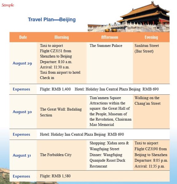 Work in groups. Help your foreign teacher to make a three-day travel plan in China.Then explain it in class. Remember to cover flights, hotels, transport and expenses. The following sample is provided for your reference.