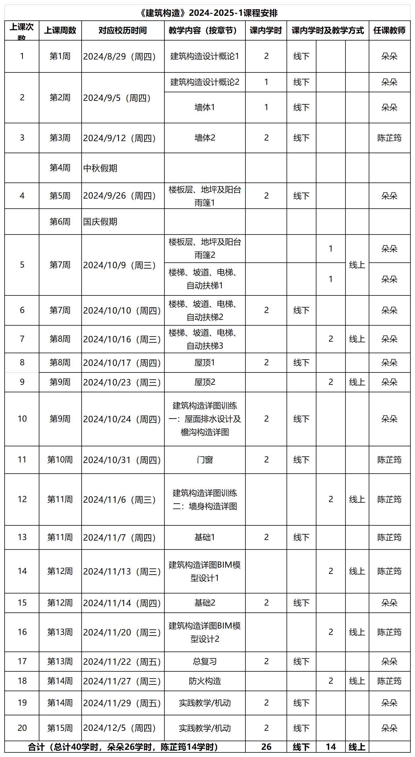 14 | 实践教学:构造相关工程实例二(第2章墙体;第6章:屋顶) | (1) 延庆山地新闻中心 (2) 上海“平改坡”工程 | 1 | 案例分析 讲授 专题研讨 | 目标4 |