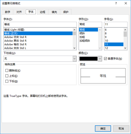 选中要设置字体的单元格,在“设置单元格格式”对话框中选择“字体”选项卡,可设置字体、字形、字号、下划线、颜色、上标、下标、删除线等,在预览区可以看到设置的最终样式,如图4-26所示。