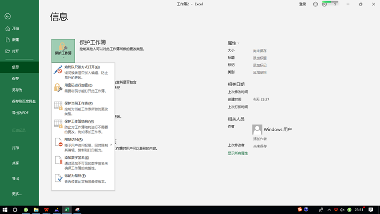 当工作簿中的信息比较重要,不希望他人随意打开修改工作簿时,可以给工作簿设置保护信息。选择“文件”按钮下的“信息”命令,对“保护工作簿”中的选项进行设置,如图4-6所示。