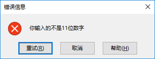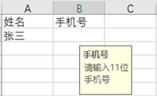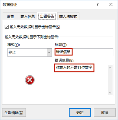 【例4-2】在B列中要输入手机号码,当输入的不是11位数字时提示错误。