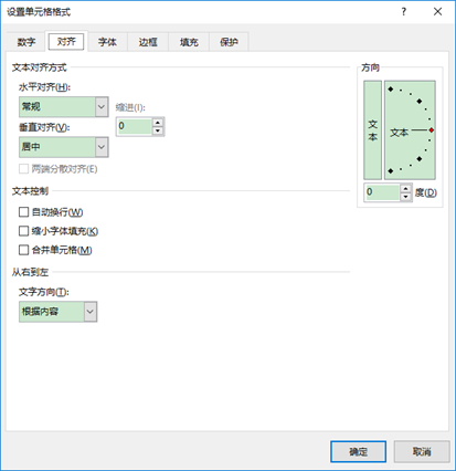 方向:可以改变单元格内容的显示方向,可以通过输入数值来实现。