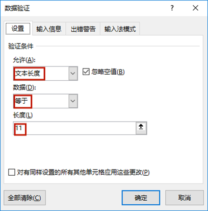 ②在“设置”选项卡中,“允许:”下拉列表中选择“文本长度”,“数据:”下拉列表中选择“等于”,“长度”下输入“11”,如图4-16所示。