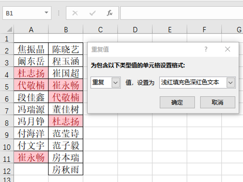 ②单击“开始”选项卡“样式”组中“条件格式”下的“突出显示单元格规则”下的“重复值”命令,如图4-32所示,弹出“重复值”对话框,默认情况下重复值设置为浅红填充色深红色文本,单击“确定”按钮。两列重复的名字都变红色显示,非常醒目,如图4-33所示。