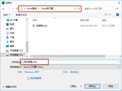 ⑩单击“文件”按钮中的“保存”命令,在弹出的“另存为”页面中选择“浏览”,弹出“另存为”对话框,如图4-37所示。选择合适的位置,在“文件名”处输入“成绩单”。