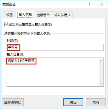 ③在“输入信息”选项卡中,“标题:”输入“手机号”,“输入信息:”下输入“请你输入11位数字”,如图4-17所示。