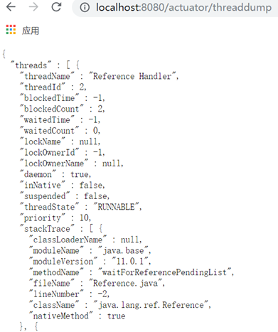 该端点用来暴露程序运行中的线程信息。它使用java.lang.management.ThreadMXBean的dumpAllThreads方法来返回所有含有同步信息的活动线程详情。启动并暴露该端点后,可通过“http://localhost:8080/actuator/threaddump”测试访问,测试效果如图10.14所示。