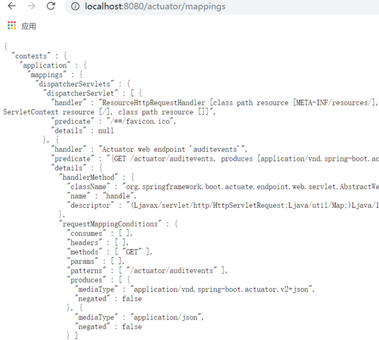 该端点用来返回所有Spring MVC的控制器映射关系报告。启动并暴露该端点后,可通过“http://localhost:8080/actuator/mappings”测试访问,测试效果如图10.8所示。
