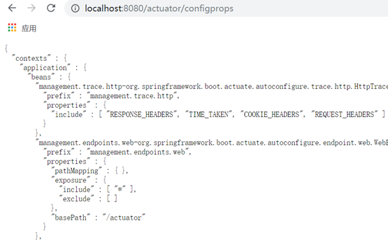 该端点用来获取应用中配置的属性信息报告,prefix属性代表了属性的配置前缀,properties代表了各个属性的名称和值,例如可以设置spring.http.encoding.charset="UTF-8"。启动并暴露该端点后,可通过“http://localhost:8080/actuator/configprops”测试访问,测试效果如图10.6所示。