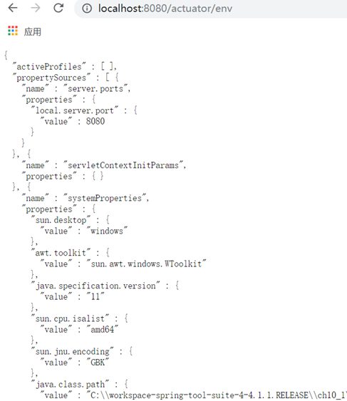 该端点与configprops端点不同,它用来获取应用所有可用的环境属性报告。包括:环境变量、JVM属性、应用的配置、命令行中的参数等内容。启动并暴露该端点后,可通过“http://localhost:8080/actuator/env”测试访问,测试效果如图10.7所示。