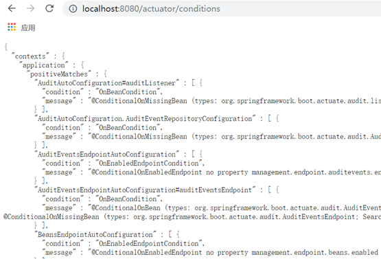 该端点在1.x版本中名为autoconfig,该端点用来获取应用的自动化配置报告,其中包括所有自动化配置的候选项。同时还列出了每个候选项自动化配置的各个先决条件是否满足。所以,该端点可以帮助我们方便的找到一些自动化配置为什么没有生效的具体原因。该报告内容将自动化配置内容分为三部分:positiveMatches中返回的是条件匹配成功的自动化配置;negativeMatches中返回的是条件匹配不成功的自动化配置;unconditionalClasses无条件配置类。启动并暴露该端点后,可通过http://localhost:8080/actuator/conditions 测试访问。