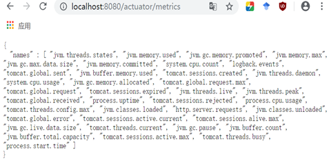 该端点用来返回当前应用的各类重要度量指标,比如:内存信息、线程信息、垃圾回收信息等。启动并暴露该端点后,可通过“http://localhost:8080/actuator/metrics”测试访问,测试效果如图10.10所示。