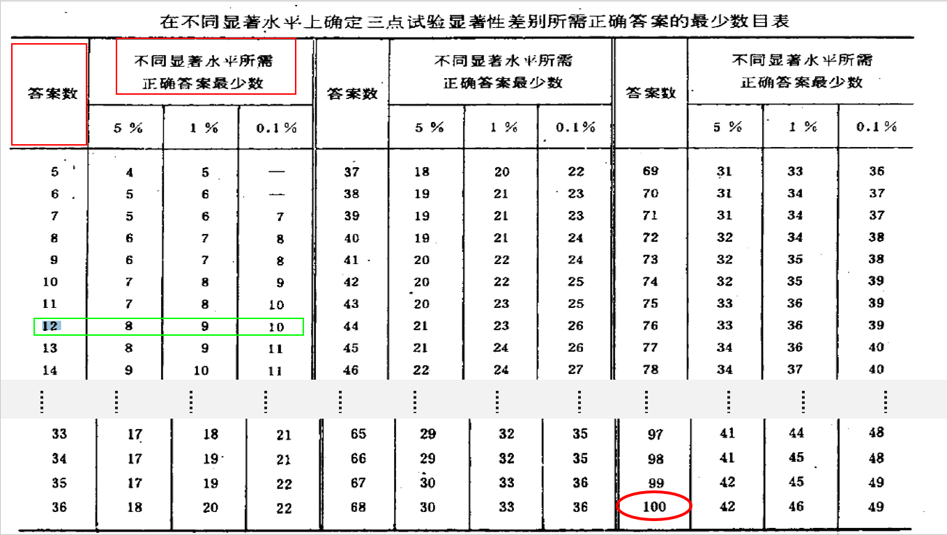 按三点试验法要求统计回答正确的问答表数,查表可得出两个样品间有无差异。36 张有效鉴评表,21 张正确选择出单个样品。