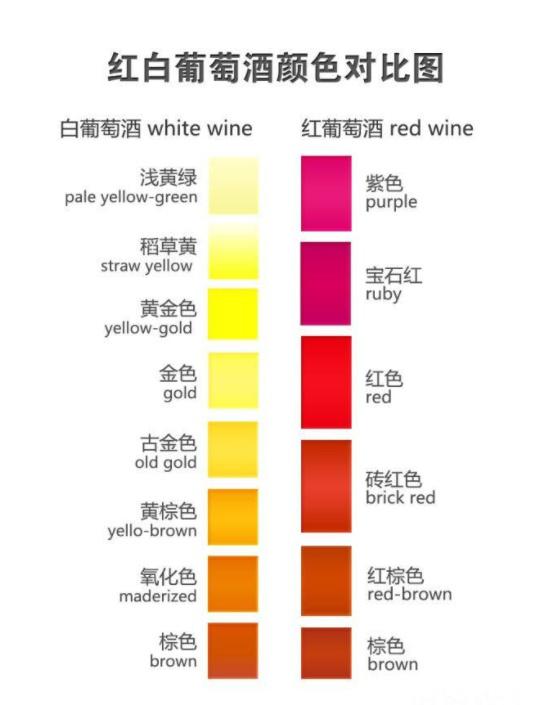 红葡萄酒的颜色变化与白葡萄酒恰好相反,红酒的颜色会随着时间的推移而变得越来越淡。一般来说,红酒从年轻到年老,呈现的酒液为紫红色、宝石红色、石榴红直至红棕色。