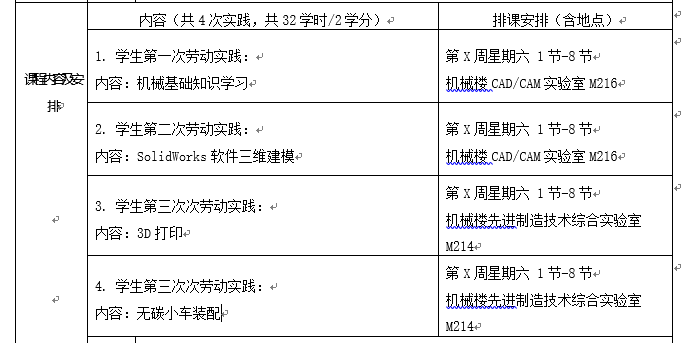 本次劳动教育实践项目以贯彻马克思主义劳动观点,发挥劳动育人功能,通过先进制造技术,让学生从设计到加工完成无碳小车的制作。通过学习,使学生对先进制造技术的目的、意义、任务、过程及中心教学资源有较全面的了解,牢固树立安全第一的观念,培养学生扎实的基础技能、完整的工程知识体系、初步的创新意识、思维能力以及管理理念。具体的时间目标如下: